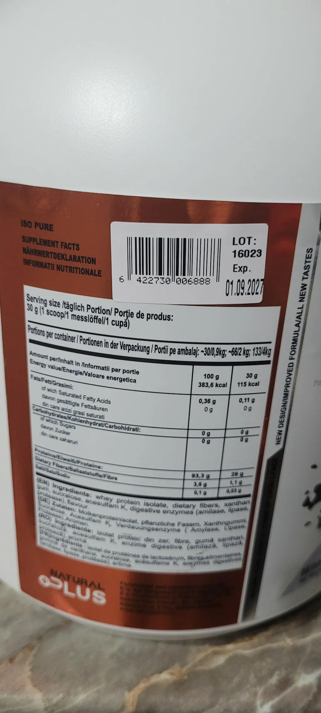 Iso Pure Protein contiene fibra dietética importante para la salud digestiva y la regulación del tránsito intestinal.